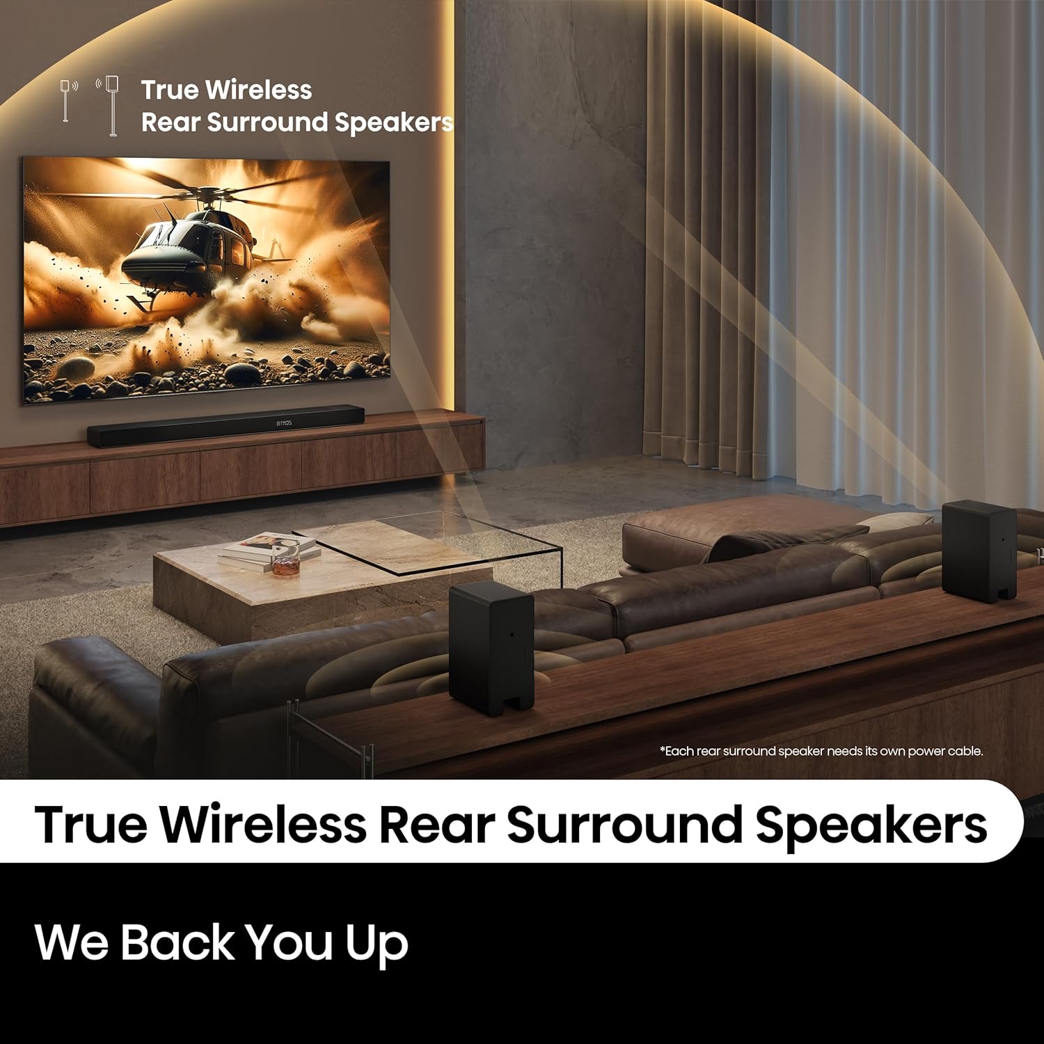 Les enceintes satellites arrière sans fil complètent l’écoute surround pour une immersion sonore à 360 degrés.