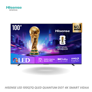 The Hisense 100Q7N is a 100-inch (254 cm) 4K QLED TV that offers an immersive visual and sound experience, ideal for movie and game lovers. Thanks to Quantum Dot technology, it displays more than a billion colors with exceptional accuracy. Compatibility with HDR formats such as Dolby Vision IQ , HDR10 + and HLG ensures deep contrasts and striking details, even in the darkest scenes. The audio system integrates a subwoofer for powerful bass and supports Dolby Atmos , thus delivering enveloping three-dimensional sound. The VIDAA U7.6 operating system allows quick access to your favorite apps like Netflix , YouTube and Prime Video , with a smooth and intuitive interface. Connectivity is complete with dual-band Wi-Fi , Bluetooth 5.0, 4 HDMI 2.1 ports and 2 USB ports, making it easy to connect all your devices. Pro Game Mode with a variable refresh rate of up to 144 Hz and FreeSync Premium technology ensure a smooth, tear-free gaming experience. Finally, integrated voice control and compatibility with voice assistants such as Alexa and Google Assistant make it even more convenient to use on a daily basis. This choice is ideal for the Grand Magal of Touba.