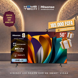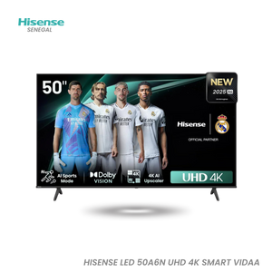 HISENSE LED 50A6N UHD 4K SMART VIDEO The Hisense LED 50A6N UHD 4K Smart VIDAA is a 50-inch television that offers an exceptional visual and audio experience. With its 3840x2160 pixel UHD LED screen , it delivers sharp and detailed images. The 60Hz refresh rate and 120Hz smooth motion rate ensure smooth images, perfect for sports, action movies, and video games. The 5000 contrast and 8-bit color depth deliver vivid and realistic colors . The VIDAA operating system allows quick and intuitive access to thousands of apps and streaming services, such as Netflix, Disney+, YouTube, and Prime Video. DTS:X technology provides an immersive audio experience, while Game Mode and Sports Mode enhance performance for game and sports fans. Additionally, this TV is equipped with three HDMI ports, two USB ports, and an Ethernet port, making it easy to connect to...