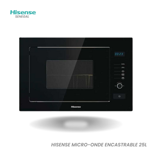 HISENSE 25L BUILT-IN MICROWAVE GRILL-SCREEN-BLACK HB25MOBX7G The Hisense HB25MOBX7G built-in microwave combines performance, modern design and ease of use for a stylish and functional kitchen. With a 25-litre capacity, it is ideal for families and everyday cooking. Its 900W power allows for fast and even cooking of dishes. Equipped with a powerful quartz grill , it ensures perfect golden cooking for gratins, pizzas and meats. Thanks to its 8 automatic programs , you can prepare your meals effortlessly. Its LED display with digital clock offers a clear and intuitive interface. The elegant black design with touch controls fits perfectly into any modern kitchen. The 315mm glass turntable guarantees even cooking across the entire surface. The easy-to-clean stainless steel cavity ensures optimal hygiene after each use. The automatic defrost function by time or weight is ideal for frozen food. It also...