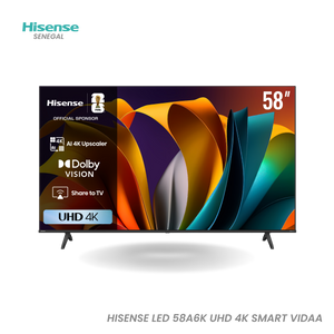 The HISENSE LED 58A6K UHD 4K TV offers an immersive viewing experience with its Ultra HD 4K resolution and HDR , Dolby Vision and HLG technologies . Featuring a 58-inch screen , it ensures clear, sharp and contrasty images. Thanks to the VIDAA U6 smart interface , you can easily access your favorite apps such as YouTube, Netflix and Prime Video. On the sound side, it is equipped with 16W speakers with Dolby Audio and DTS Virtual:X for a captivating sound environment. It also has gaming features like ALLM and VRR for optimal fluidity. Connected via Wi-Fi and Bluetooth, with 3 HDMI and 2 USB ports , this model combines performance, modern design and complete connectivity.