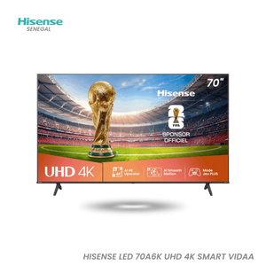 The Hisense LED 70A6K UHD 4K Smart VIDAA is a 70-inch television that offers an exceptional visual and sound experience. Thanks to its 3840x2160 pixel UHD LED screen, it provides sharp and detailed images. The 60 Hz refresh rate and 120 Hz smooth motion rate ensure smooth images, perfect for sports, action movies and video games . The 5000 contrast and 8-bit color depth allow for vivid and realistic colors. The VIDAA operating system allows quick and intuitive access to thousands of applications and streaming services, such as Netflix, Disney+, YouTube and Prime Video. DTS:X technology provides an immersive audio experience, while Game Mode and Sports Mode improve performance for video game and sports fans. Additionally, this TV is equipped with three HDMI ports, two USB ports, and an Ethernet port, making it easy to connect to other devices. Its sleek, compact design fits easily into any living space. Easy to use and maintain, this TV is a practical and aesthetic solution for your home. This choice is ideal for the Grand Magal of Touba.
