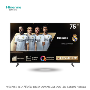 HISENSE TV 75U7N 4K SMART VIDEO The Hisense 75U7N is a 4K ULED TV with Quantum Dot technology and Smart Vidaa. It offers four times the resolution of Full HD, allowing you to enjoy incredible details and vibrant colors. The Mini-LED Pro ensures brighter whites and deeper blacks, with a maximum luminance of 1500 nits. Full Array Local Dimming improves image clarity, and the billions of color shades created by Quantum Dot technology provide an immersive viewing experience. The Hi-View PRO engine uses AI to improve picture quality in real time, with features such as Dynamic Tone Mapping Pro and AI HDR Enhancement. The TV is compatible with all major HDR formats, including Dolby Vision, HDR10++ , and HLG Combine Hisense. In short, the Hisense 75U7N combines advanced technology and elegant design for an exceptional viewing experience. This is the...