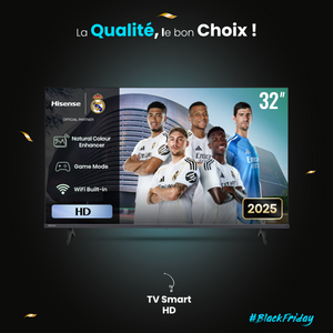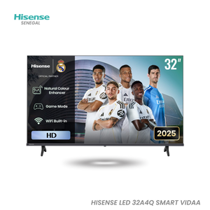 Distribuée par Hometech Sénégal, distributeur officiel de Hisense, cette TV combine qualité, prix et innovation. Elle est équipée de deux ports HDMI, un port USB et un port Ethernet, facilitant les connexions avec d'autres appareils. Son design fin et compact s’adapte à tout type d’intérieur.